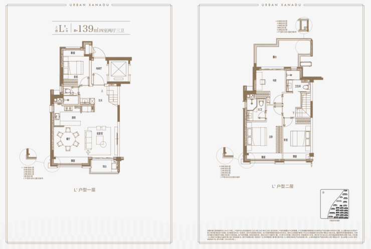 建面约139㎡上叠户型,三层是会客区,四层是居住区,阳台+露台+多个飘窗设计,附加空间非常大,在别墅类产品中实属罕见!