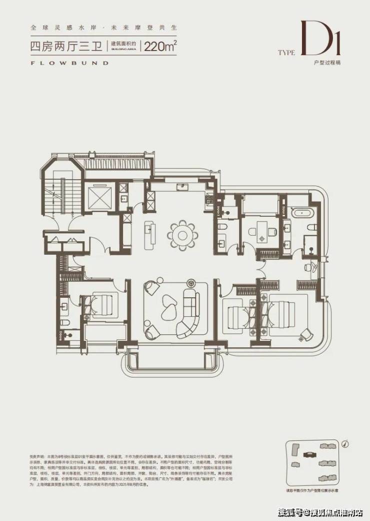 建面约220㎡四房,位于楼王位置,南北无遮挡,中西双厨,多阳台,双套房,加上约3.3米的超标层高,标准的一生之宅!