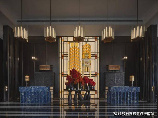 其次,项目的很多细节都融入了海派经典元素,比如落客区美轮美奂的约300㎡彩色玻璃穹顶,艺术连廊拱形廊道灵感都来自和平饭店。彩绘花窗的拱门造型则取自武康大楼。
