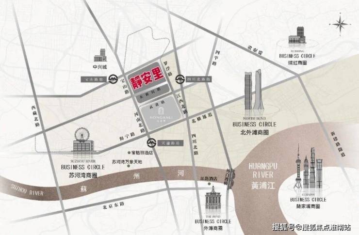 项目紧邻苏州河滨水岸线,直线距外滩约1.4公里,距上海火车站约800米,区位优势显著。