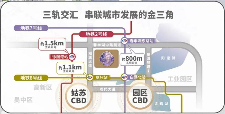 对外,有相城大道、东环快速路、春申湖快速、星湖街/中环北线,自驾三首歌的时间,就顺畅通达园区CBD。哪怕是去上海或长三角其他区域,也能做到1.5小时生活圈。