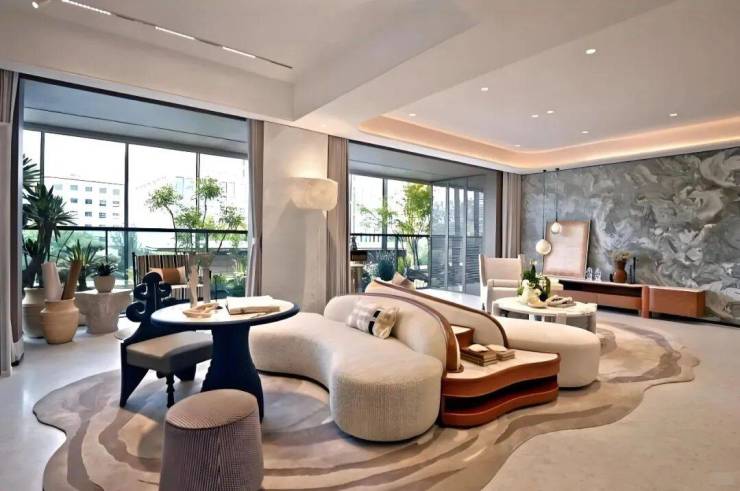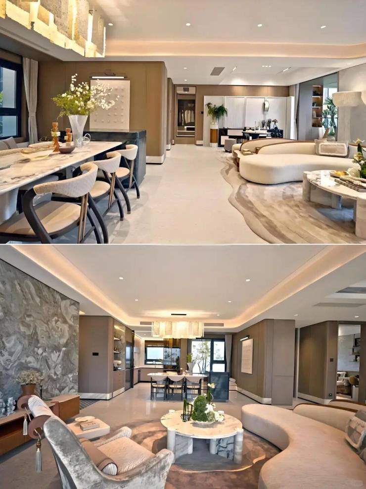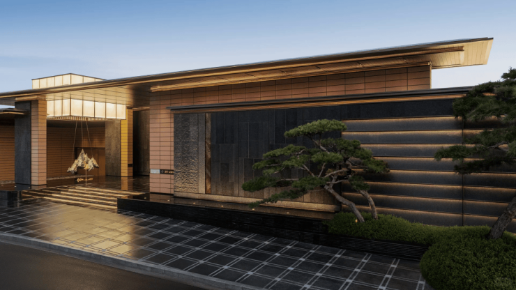 建筑立面萃取宋代美学神韵,以现代设计手法重塑传统风骨。线条简约流畅,横向舒展的形态与自然山水浑然一体。细节处理极尽精炼,从装饰纹样到屋檐轮廓,无不匠心独运,再现宋式雅致。材质搭配强调质感与色调的和谐统一,共同营造出古朴静谧的整体氛围。以清透灵动的浅米黄与沉稳内敛的高级灰为主色调,辅以古铜色金属细节点缀,营造精致雅致的视觉层次。空间设计强调通透流动感,巧妙将空中庭院与垂直绿化融入室内布局,打造自然与建筑和谐共生的沉浸式体验。