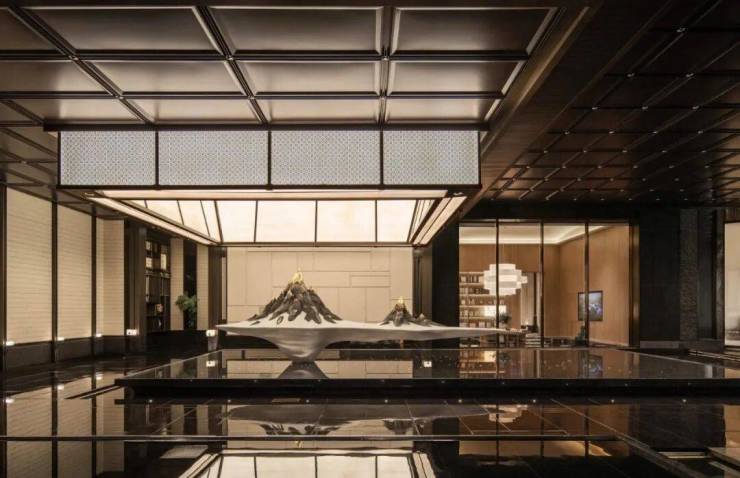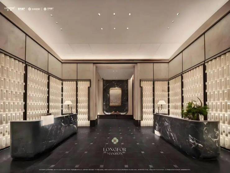大门采用罕见非遗工艺精心打造,通高5.5米、宽3.6米,以2.4吨黄铜铸就而成。门上“水纹”由苏派匠人手工锻打8万次,形似史卷铺展,触感温润。香槟金方格吊顶与悬浮云石相映成趣,刚柔相济,宛如诗句对仗,意境深远。