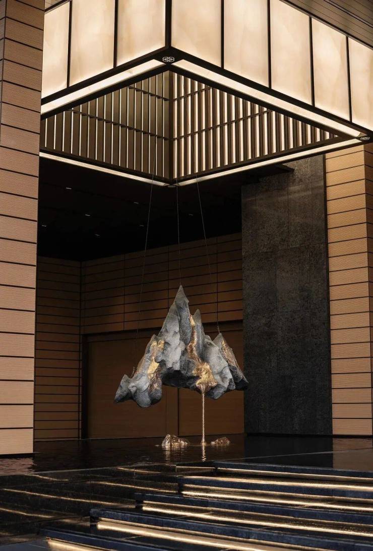 这座重达20吨的汉白玉山峰,与金箔装饰的“日照金山”相映成辉的雕塑,景致在眼前徐徐展开,每一寸金箔都凝聚着对自然盛景的精妙复刻。当目光追随雕塑的轮廓,匠人手工雕琢的曲线仿佛勾勒出云海翻腾的壮阔景象。在这里,“日照金山”造型的雕塑不再仅仅是独立的艺术品,它成为东吴原著与自然对话的桥梁,是居者与山野自然共情的纽带。