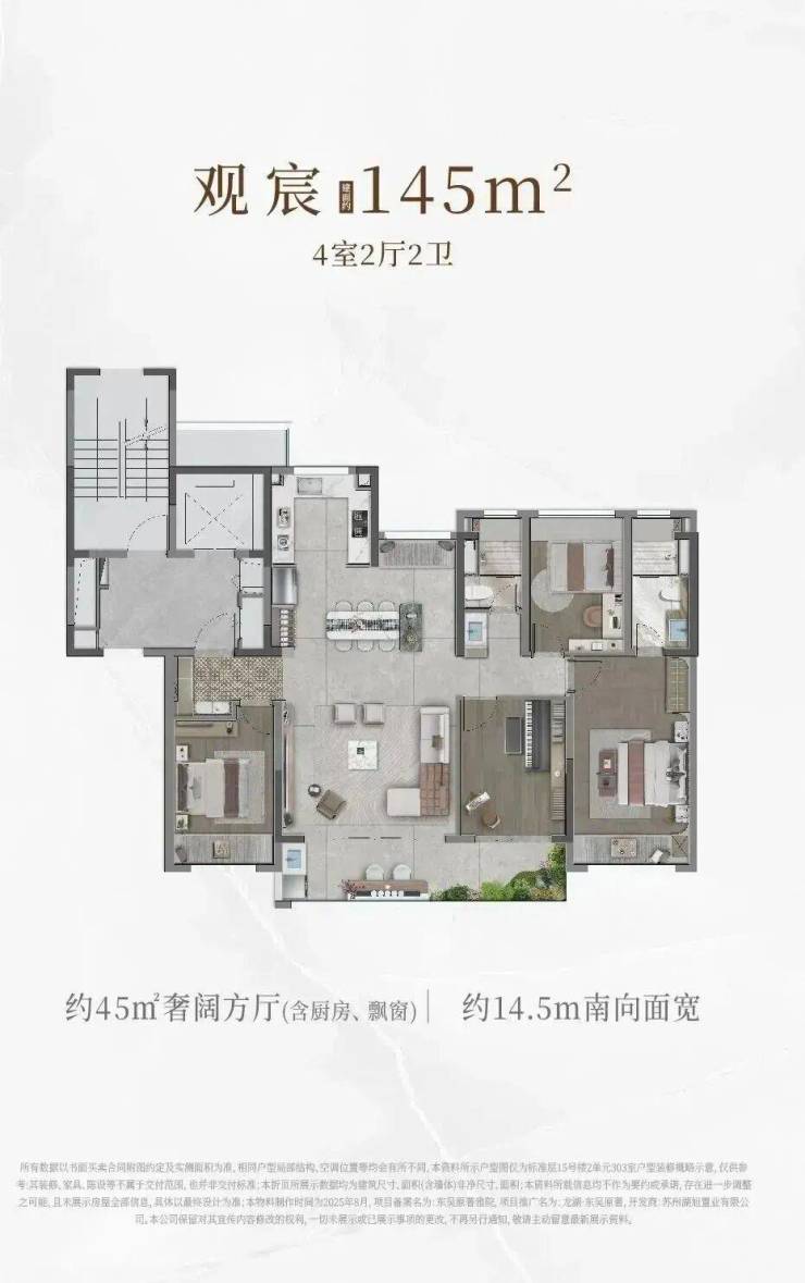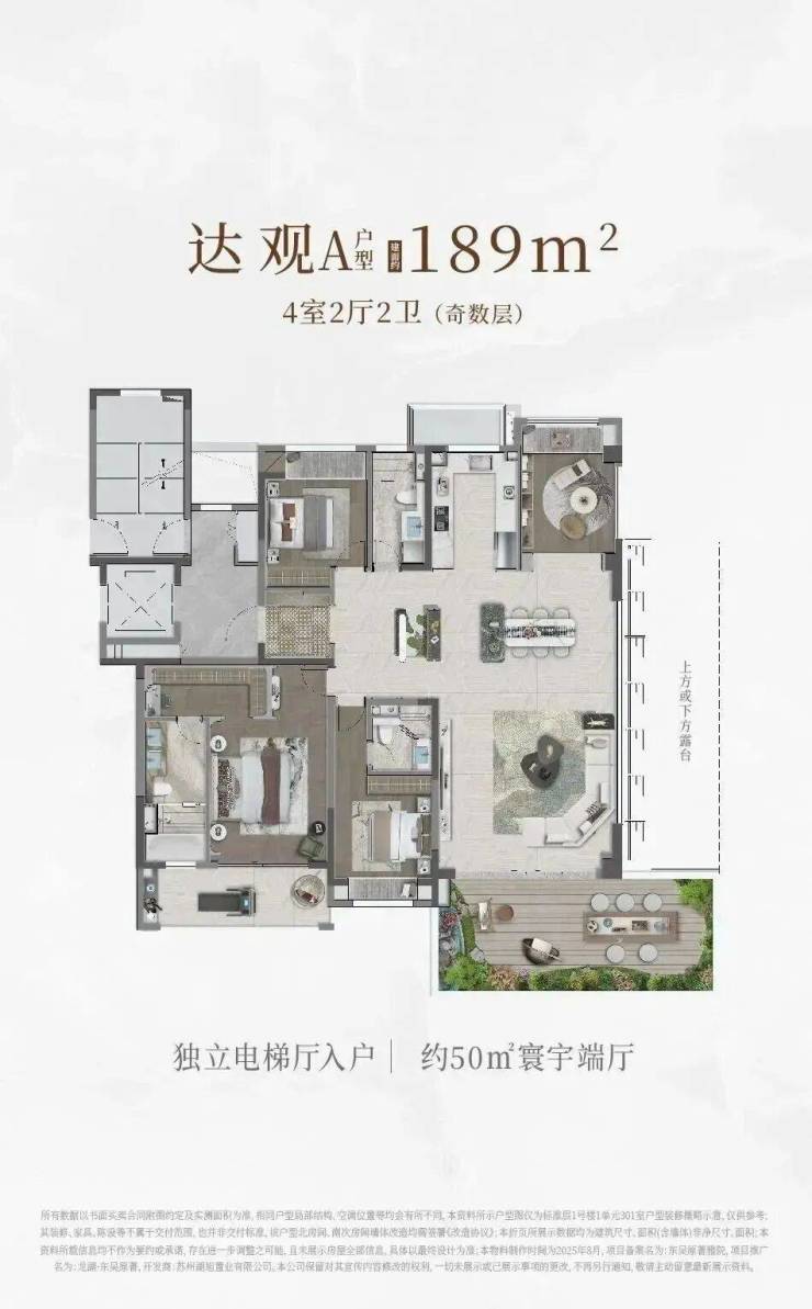 189㎡四代住宅洋房,奇数层奢享约50㎡寰宇端厅,客厅“横厅+落地窗”设计,采光视野无与伦比;偶数层配备上下双露台,其中约30㎡空中庭院可自由打造成花园或茶室;独立电梯厅入户,专属过渡空间,尊享私密与宁静,告别邻里打扰。