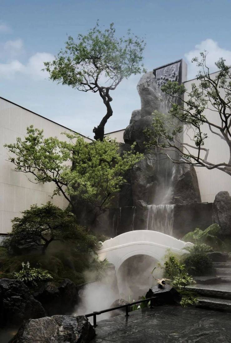门外碧波荡漾,锦鲤嬉戏其间;拱桥巧妙复刻网师园“引静桥”之韵,三步过涧,步移景异。150吨巨石精心堆叠,造就8米高龙门叠瀑,气势恢宏;其间“鲤鱼石”灵动欲飞,仿佛跃过山峦,尽揽无限风光。