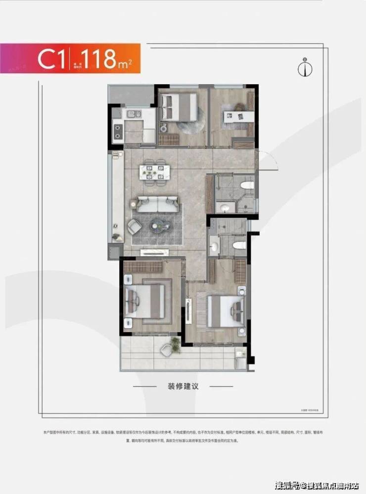 而建面约118㎡的产品即为四房两厅两卫的格局,南向双开间,双阳台相连也提供了更多的活动空间。两房朝南,区别于建面约98方户型,该户型的阳台有惊喜,是L型的。且北面多了一个房间,适合人口多的家庭。
