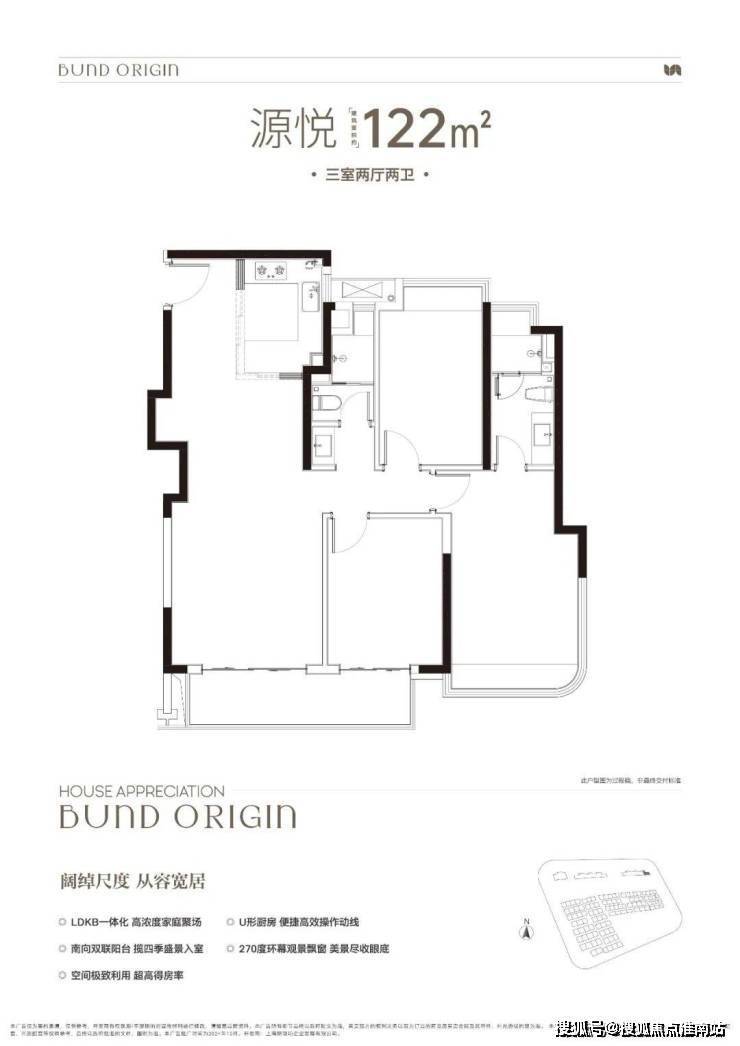 B户型是3房2厅2卫格局,三开间朝南+LDKB一体化+奢阔宽厅+全卧室带飘窗+主卧套房设计+动静分离+主卧270度飘窗,舒适度更高。外滩源著 复兴里 售楼处电话:400-9659-259