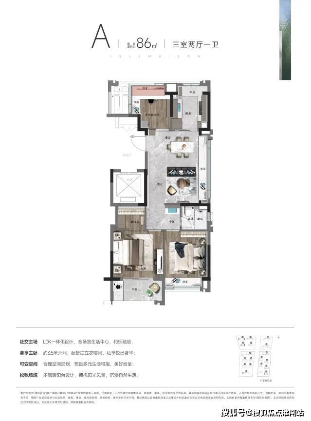 第四,主卧约3.5米的开间+宽面阳台+步入式衣帽间,对于一个约86㎡的紧凑型3房而言,这样的主卧真的太难得了。