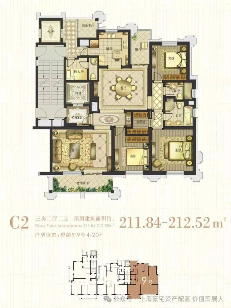 在室内空间的设计上,空中别墅拥有 宴会级餐厅 和 中西双厨房 ,所有卧室均为 全套房设计( 即便是家政房也是自带卫浴的套房),主人套房内更包含了堪比名牌精品店的 宽大衣帽间 ,无论从实用性还是豪华程度而言都是物超所值的,关键该项目的 得房率在80% ,空间尺度非常舒服。