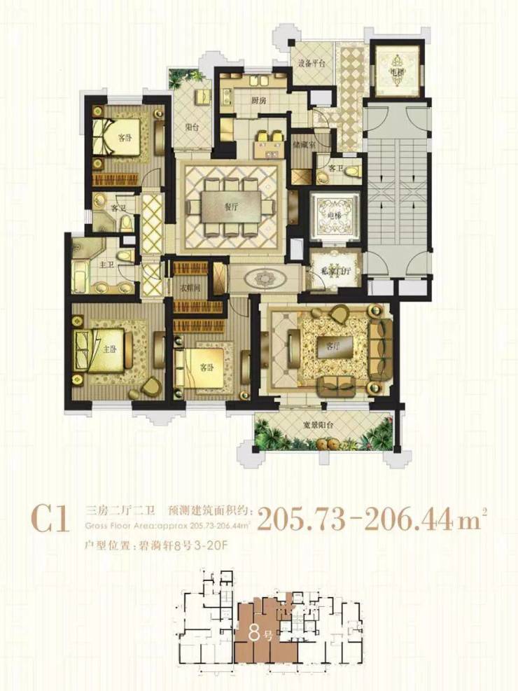 8号01室:206㎡3房2厅2卫,客厅南北通,两房朝南,一房朝北。