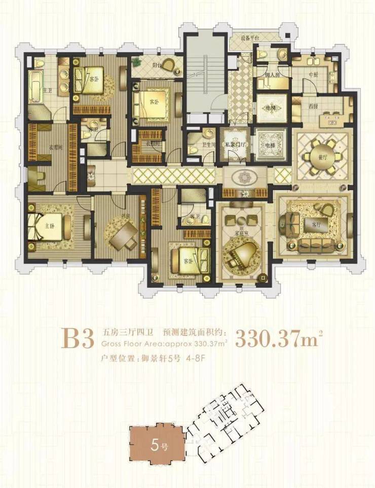 5号楼01室:330㎡6房3厅4卫,客厅朝南,四房朝南,两房朝北。