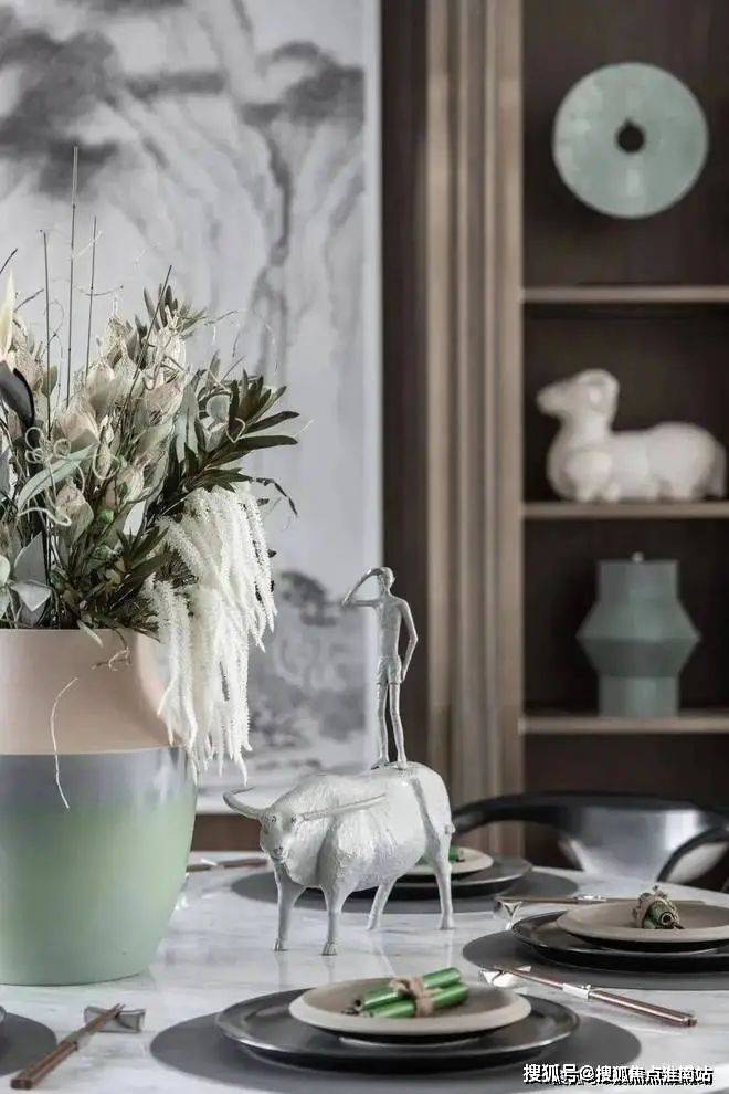 餐厅在整体设计上,沿袭了客厅的配色和风格,简约却又不失格调,尤其是山水墨画元素的融入,让用餐氛围更显温馨感。