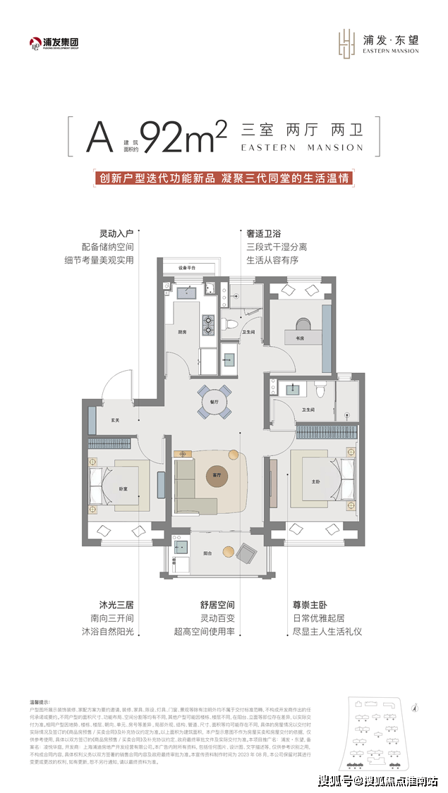 1、建面约92㎡3房2卫