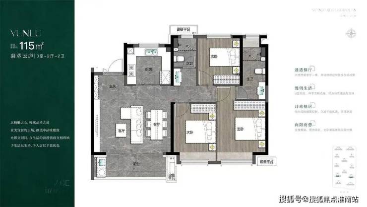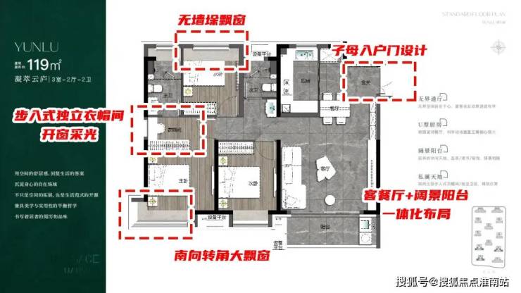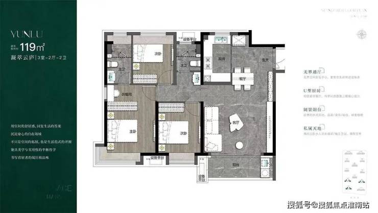 建面约119㎡三房两厅两卫户型,居住尺度进一步提升。