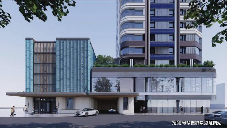 建筑立面色彩以珍珠蓝为核心,搭配香槟金、摩登红。