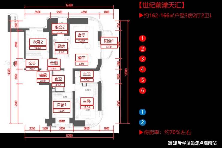世纪前滩天汇,主力户型建面约110-290㎡2-5房,总体上是做了一个偏改善的产品,不过因为是超高层,得房率是通病。具体来看下几个主力户型的尺寸👇(注:数值为建筑师估算,仅供参考)
