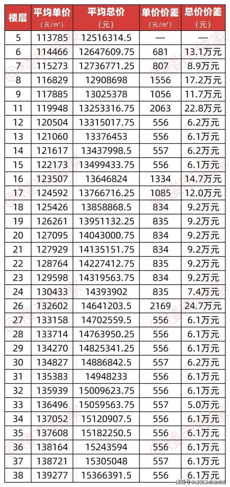 举个例子:1号楼的5-10楼之间的总价价差差不多在十几万,同样213-217㎡这个户型,11楼和平均总价的价差,对比9楼和平均总价的价差,高出109万;26楼和24楼的与平均总价的价差高达75.6万。