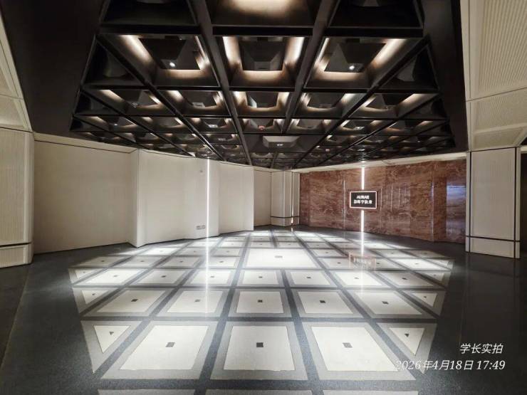 实景中,地面常采用 天然石材的拼花工艺,不同色调的石材精准对缝,形成简洁而富有层次的几何图案,彰显低调的仪式感。