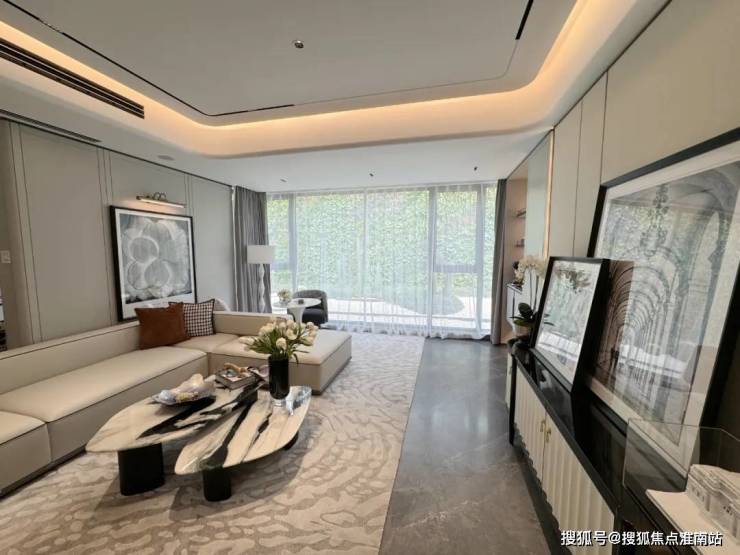 这个户型客厅面宽约4.5米(样板间里将客厅和阳台打通了),抬头是弧形悬浮吊顶,无主灯设计,地面铺装的是简一品牌90*180的大理石地砖,造价不菲。