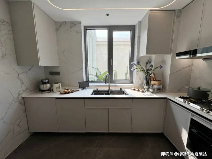 而且你们仔细看上图,所有柜门都是做了一定的斜切收边,视觉上比较统一,也方便推拉。据说交付的时候水槽下面的橱柜底部还会配上感应式灯带。