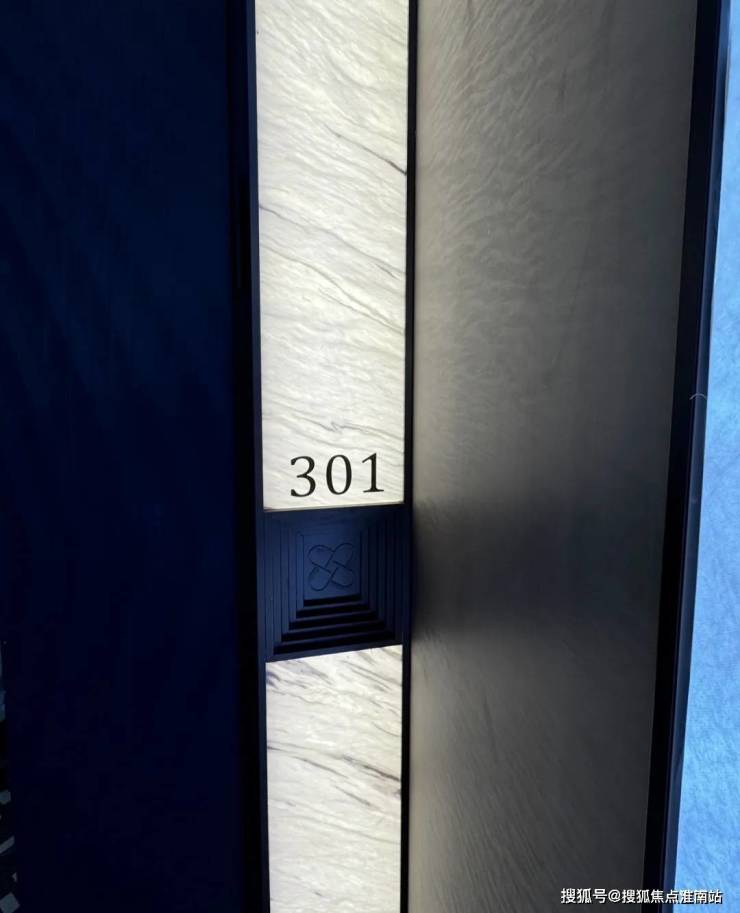 西派海上在入户门旁做了一个通顶的透光奢石,配上室号和项目独有的logo。
