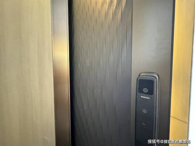 这个户型入户大门是子母门,铸铝装甲门,配飞利浦五合一门锁,这扇门正面看是带浮雕样式,另一面则是仿木纹,契合室内外的装修风格。