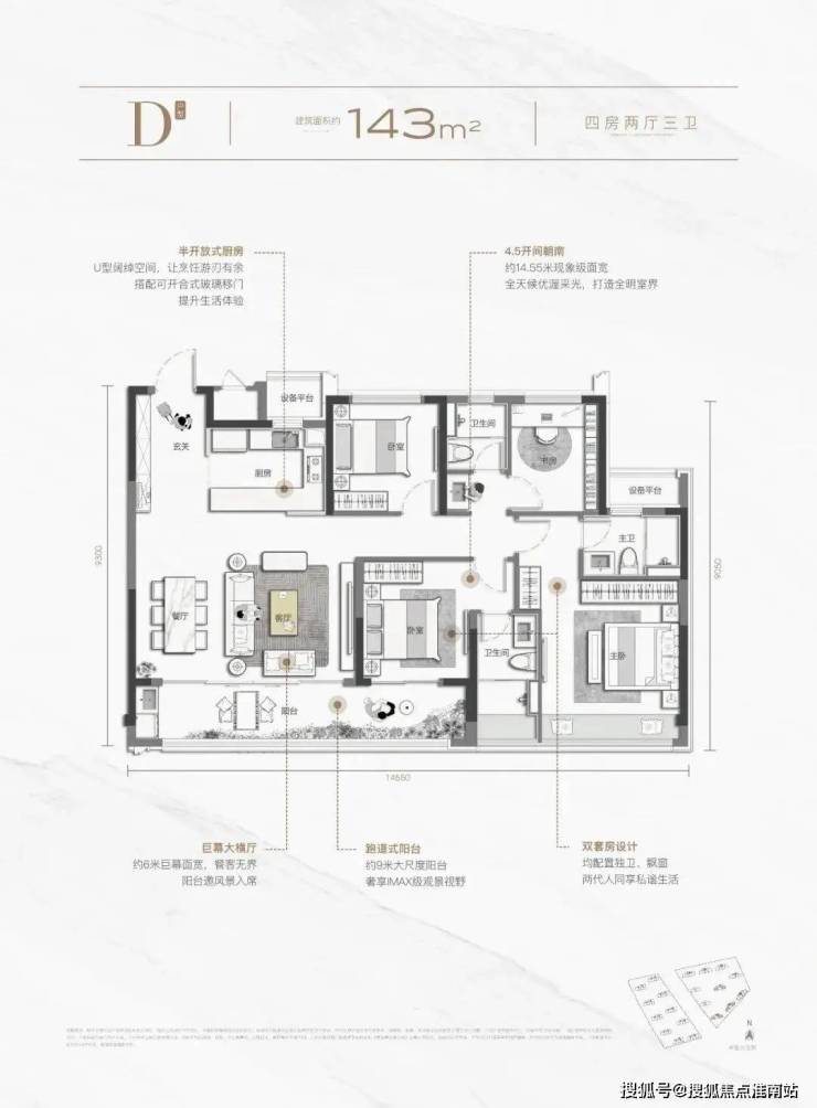 143㎡四房两厅三卫的设计,堪称改善户型“卷王”,在杭州内也是独一份。南向4.5开间,面宽约14.55米,空间尺度阔绰,且做到了双朝南套房设计,在140㎡左右的面积段中,实属难得。6米面宽大尺度横厅,搭配9米长的跑道式阳台,空间开阔感十足。