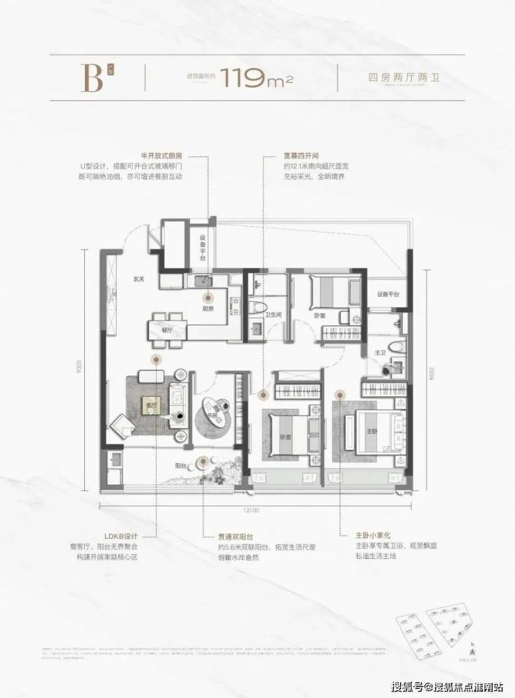 119㎡“生长型空间”同样吸睛,四房两厅两卫,且做到了四开间朝南,这在同面积段中,十分少有。主卧套房设计,有效提升了居住的私密性。LDKB设计+岛台厨房,5.6米双联阳台,俯瞰水岸盎然,重新定义了该面积段的改善可能。