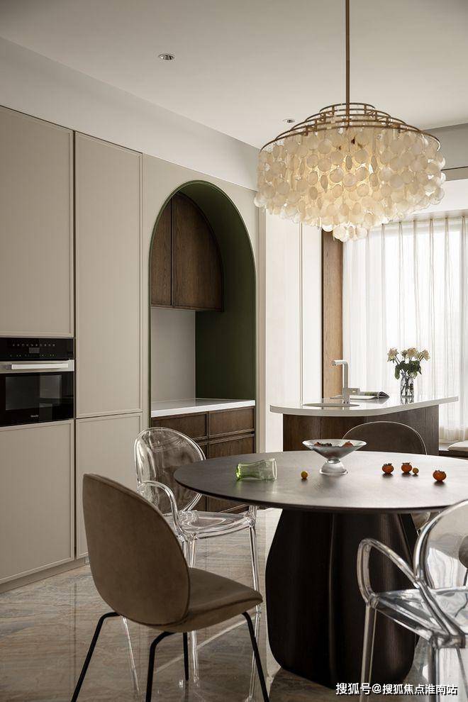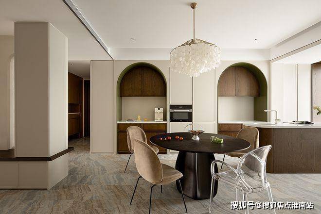 厨餐厅,内置双拱门造型,利用空间穿插、错景,划分餐厅与西厨区,开放互动气质与当代审美相结合,隔而不断,界而未界,留给空间更多的想象和延伸。