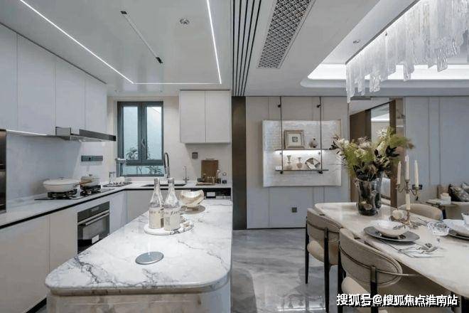 柜门白色烤漆面板,抽屉分区也都是帮大家细致划分,如多功能调味拉篮+谷物抽+碗碟拉篮等。岛台上配置可升降插座,铝合金抽屉,石材背景板的金属开放格实用性很强。