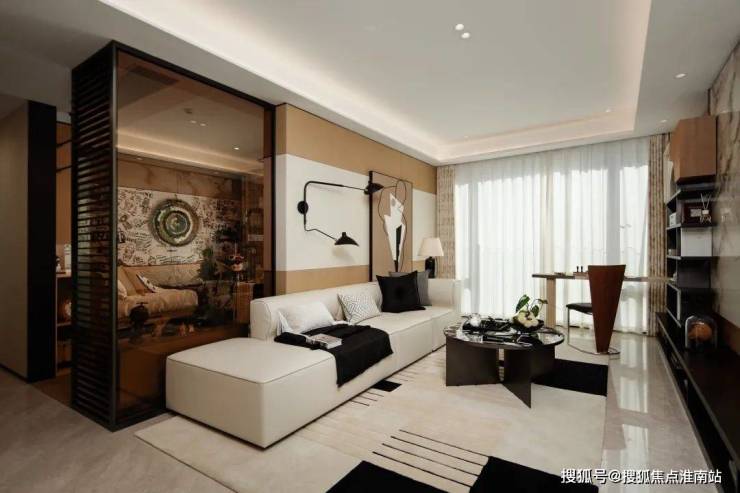 建面约105m²的户型有近6m的纯屏巨幅玻璃,大大提升了采光和观景的需求,“起床就能看到风景”。约5.95m大尺寸的横厅连接超长阳台,做出了奢阔的空间感,形成全家人欢聚的超级大公区。媲美高奢酒店的 套房主卧带走入式衣帽间、主卫和飘窗, 南次卧带阳台,还是 L型玻璃护栏设计,尺度感非常阔绰。