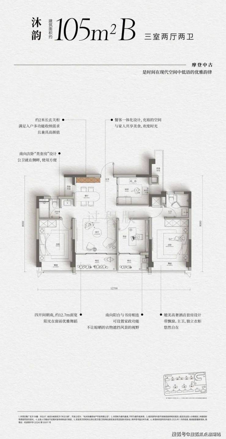 建面约105m²的户型有近6m的纯屏巨幅玻璃,大大提升了采光和观景的需求,“起床就能看到风景”。约5.95m大尺寸的横厅连接超长阳台,做出了奢阔的空间感,形成全家人欢聚的超级大公区。媲美高奢酒店的 套房主卧带走入式衣帽间、主卫和飘窗, 南次卧带阳台,还是 L型玻璃护栏设计,尺度感非常阔绰。