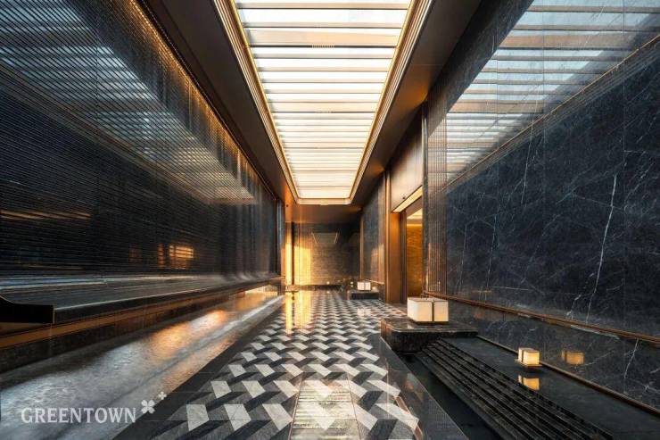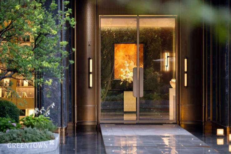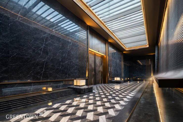 主入口知·云栖,取意西湖十景以"洄游"为理念,超52米跨度的回字形布局,重构传统"四水归堂"空间序列,约2.4米“流光礼宾” 塔冠,如悬浮的美学灯塔,与金色挑檐相映成辉,全封闭式阳台勾勒建筑轮廓,让立面如镜幕般收纳约30公里江岸鎏光!