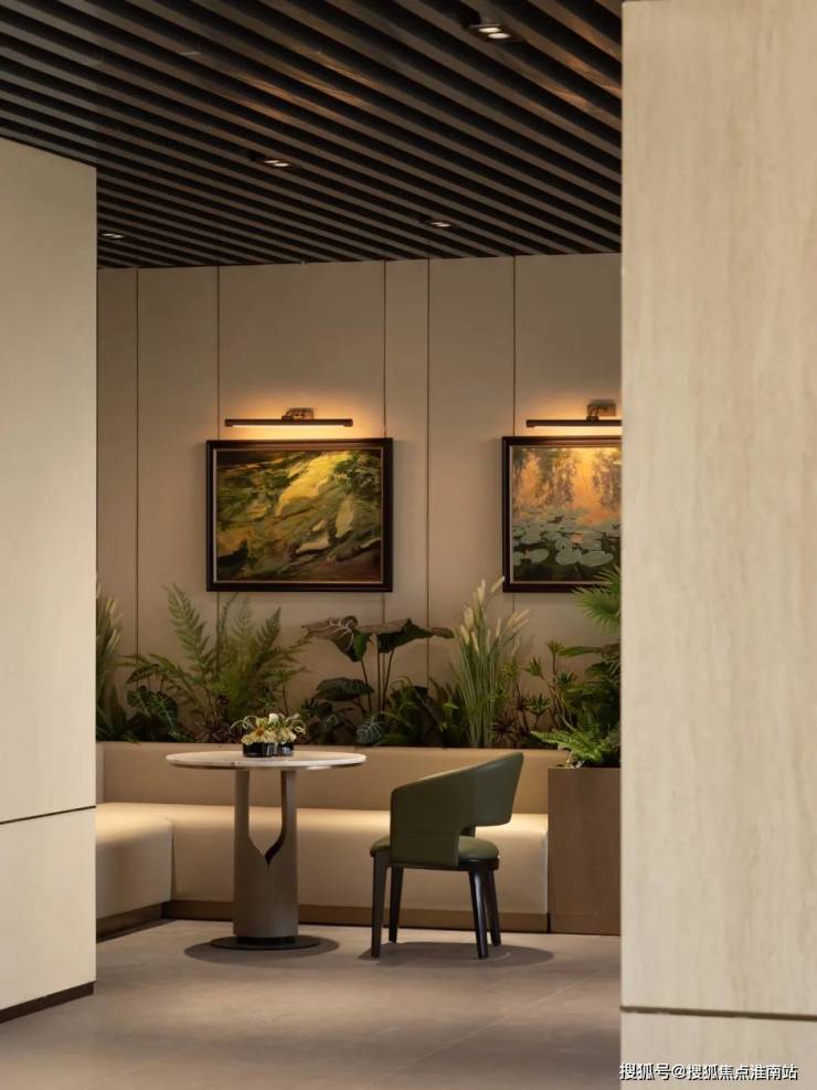 繁忙工作之余,漫步于 艺术品展览区,柔和的 米色调与木质材质,更添一份静谧而包容的从容雅致。