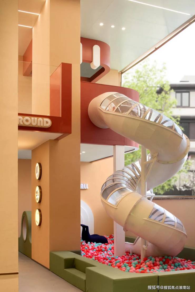 沿着通道前行,便是儿童欢乐天地。这里设置有 植物角、游戏区、周末剧场等功能模块。白色滑梯和海洋球池,是孩子们释放活力的乐园。通过互动墙与卡通壁画装置,构建寓教于乐的亲子艺术场域。