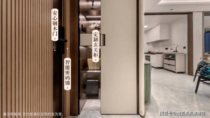 入户门选用钢木复合防盗门,坚固耐用,防火、保温亦可隔声,搭配智能密码锁,多重开启功能,贴心守护居家安全。定制玄关柜,巧妙集合收纳、置物等功能,缔造从容生活体验。