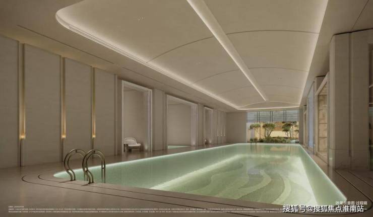 栖境泳池,曲线穹顶、奢石立面和下沉庭院景致相融,天光经采光井漫洒,云影徘徊。