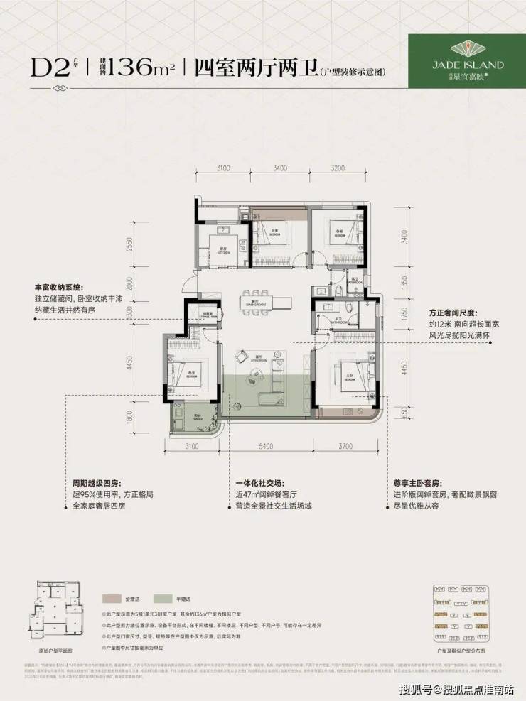 ❹建面约136㎡南厅户型,4房2厅2卫,含赠送得房率约96%。