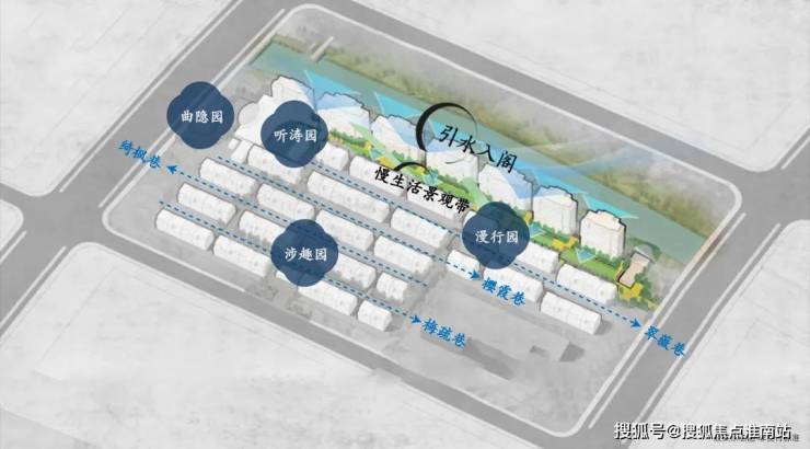 项目采用“借景共融”的造园理念,引太湖水入园,打造亲水架空泛会所,并以景观步道连接四重园林,打造尊贵归家体验。