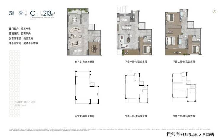 叠墅下叠建面约213㎡,私享电梯,自带花园庭院+地下室,可打造私人宴会厅、家庭影音室、私人酒窖等空间。