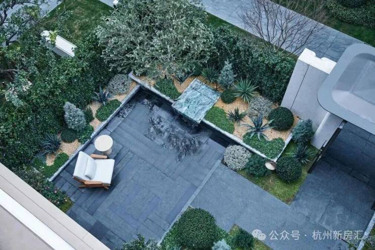 在项目高层组团和叠墅组团之间,我们看见了一个板块内体量最大,约3300方的中心景观,相比于传统紧凑排布的纯叠墅项目,松川境业主有更多大块的景观空间,且整个场景在感受上并没有被建筑隔断,下沉式庭院和双水院景观错落排布,很自然的就连接成为一个整体的大空间。