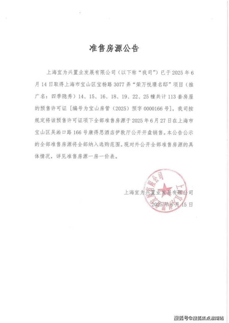 本项目推广名:四季隐秀,备案名:荣万悦璟名邸,开发商:上海宜为兴置业发展有限公司,项目销售代理公司:上海唯家房地产咨询有限公司,上海尊毓房地产经纪有限公司,广告代理公司:上海和视品牌管理有限公司,本资料为宣传资料,仅作为要约邀请,不作为销售承诺。项目不排除因政府相关规划、规定及开发商未能控制的原因而发生变化,最终以双方签署的正式《商品房买卖合同》及其他相关协议文本为准。预售证号:宝山房管(2025)预字0000166号。资料发布时间:2025年6月。
