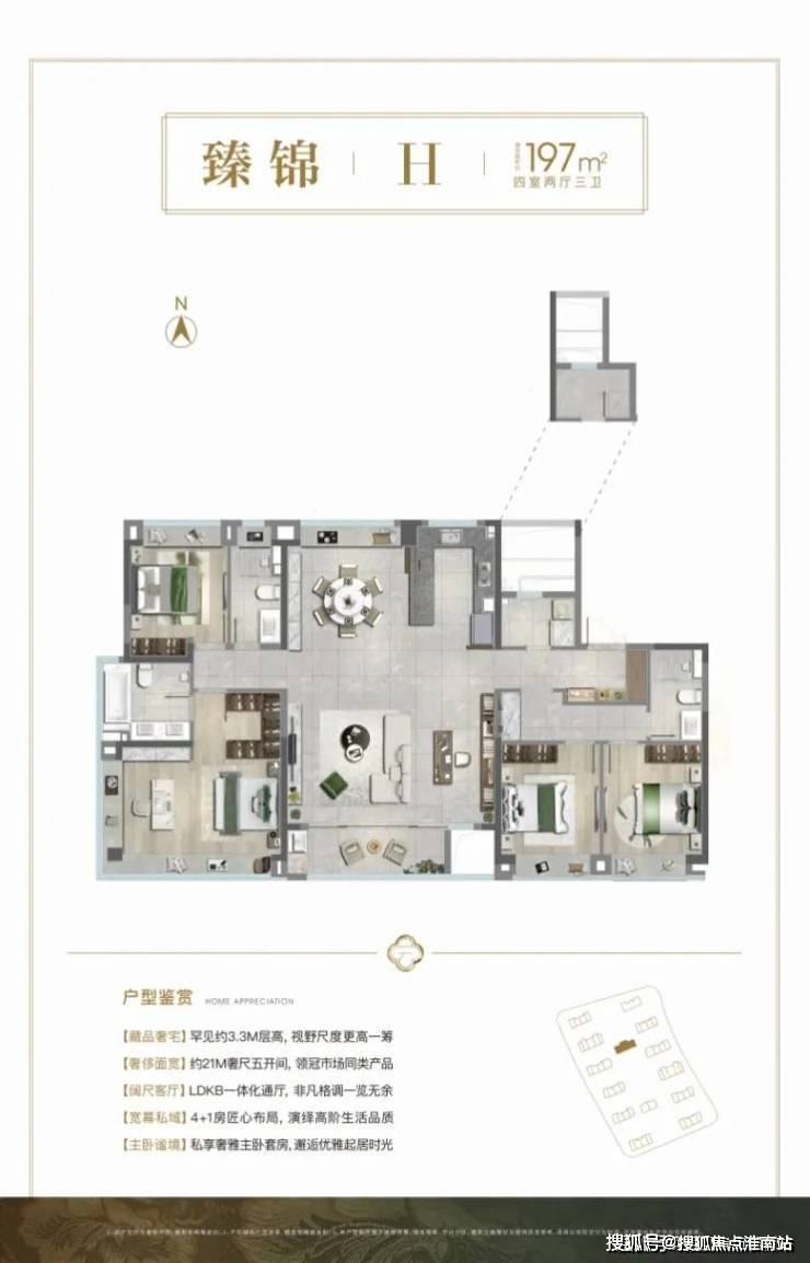 197㎡四房三卫创新设计,6.6米南向客厅、270°转角飘窗,主卧独立入户动线,兼顾私密性与仪式感。3.3米层高、一梯一户、非对称L型立面设计,铝板+玻璃外立面彰显现代美学,细节之处尽显尊崇!