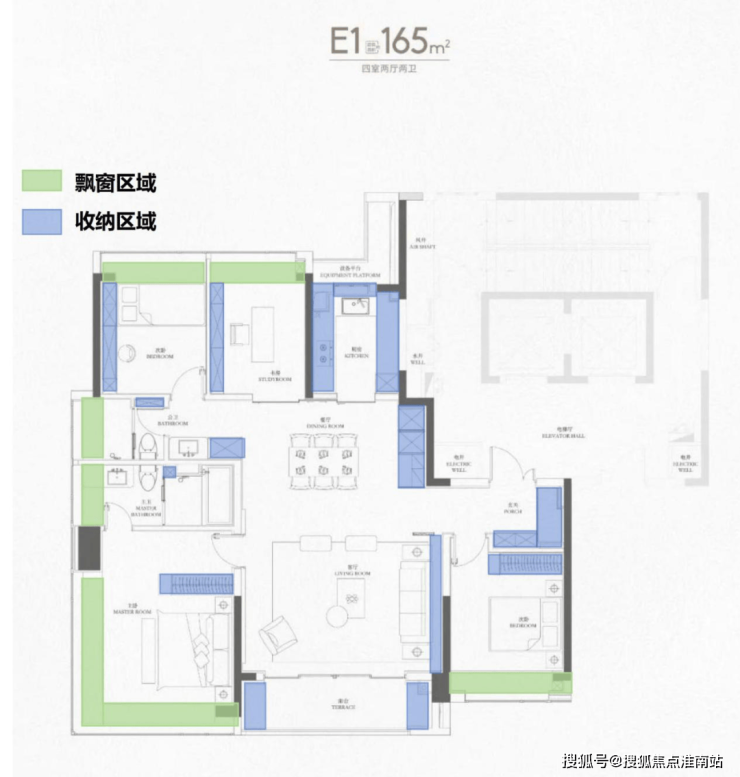 下图蓝色为收纳区域,绿色部分即飘窗区域: