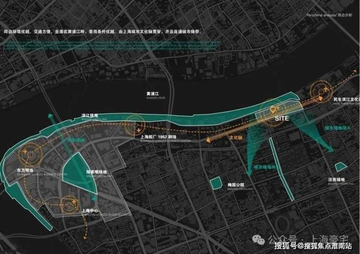 地块独占陆家嘴滨江约1.5km岸线,南面是万科翡翠滨江、西侧陆家嘴壹号院、恒大滨江华府,东侧民生路渡口。