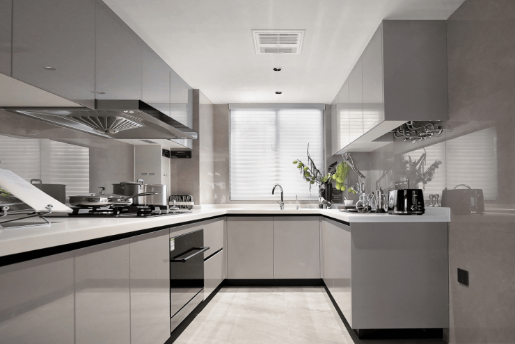 厨房空间,采用铝合金玻璃PVC饰面的免漆门套及铝合金移门,三件套使用老板的油烟机、燃气灶、洗碗机交付,更有摩恩的水槽和龙头、定制的组合橱柜。