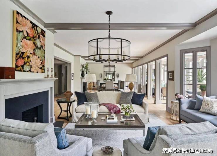 从客厅开始,整个空间都遍布着蓝色的元素,设计师以星座为主题进行设计,搭配上JamesThomas的茶几、HollyHunt的沙发、Minotti的扶手椅和AndriannaShamaris的边桌,打造既高级又充满梦幻感的居家空间.