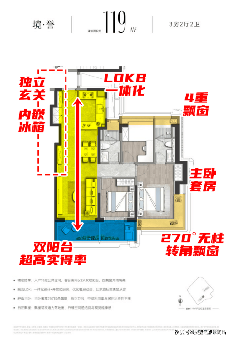 全屋非承重飘窗设计,比传统飘窗空间更大、更实用,边套主卧更升级270°全景飘窗。