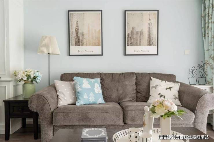 ▲ 沙发随性之中满载生活气息,两幅斑驳的都市装饰画,通过做旧提升了客厅整体格调。